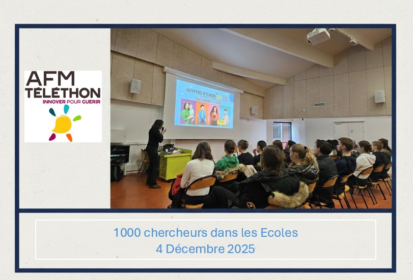Dans le cadre de l’action nationale « 1000 chercheurs dans les écoles », soutenue par l’AFM-Téléthon, notre établissement a eu l’honneur d’accueillir, le 4 décembre 2025, Mme Peggy Lafuste, professeure de biologie cellulaire à l’Université Paris-Est Créteil. Mme Lafuste est : Co-responsable de la L2 Sciences pour la Santé, Co-responsable du parcours de M1 BTCG…